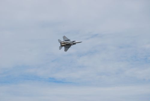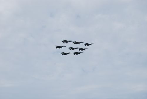 F15の編隊飛行です。T-4ブルーインパルスのような機敏さはなく、見た感じも「ノッソリ」とした重厚感を感じさせてくれます。飛行音も「爆音」ですね。